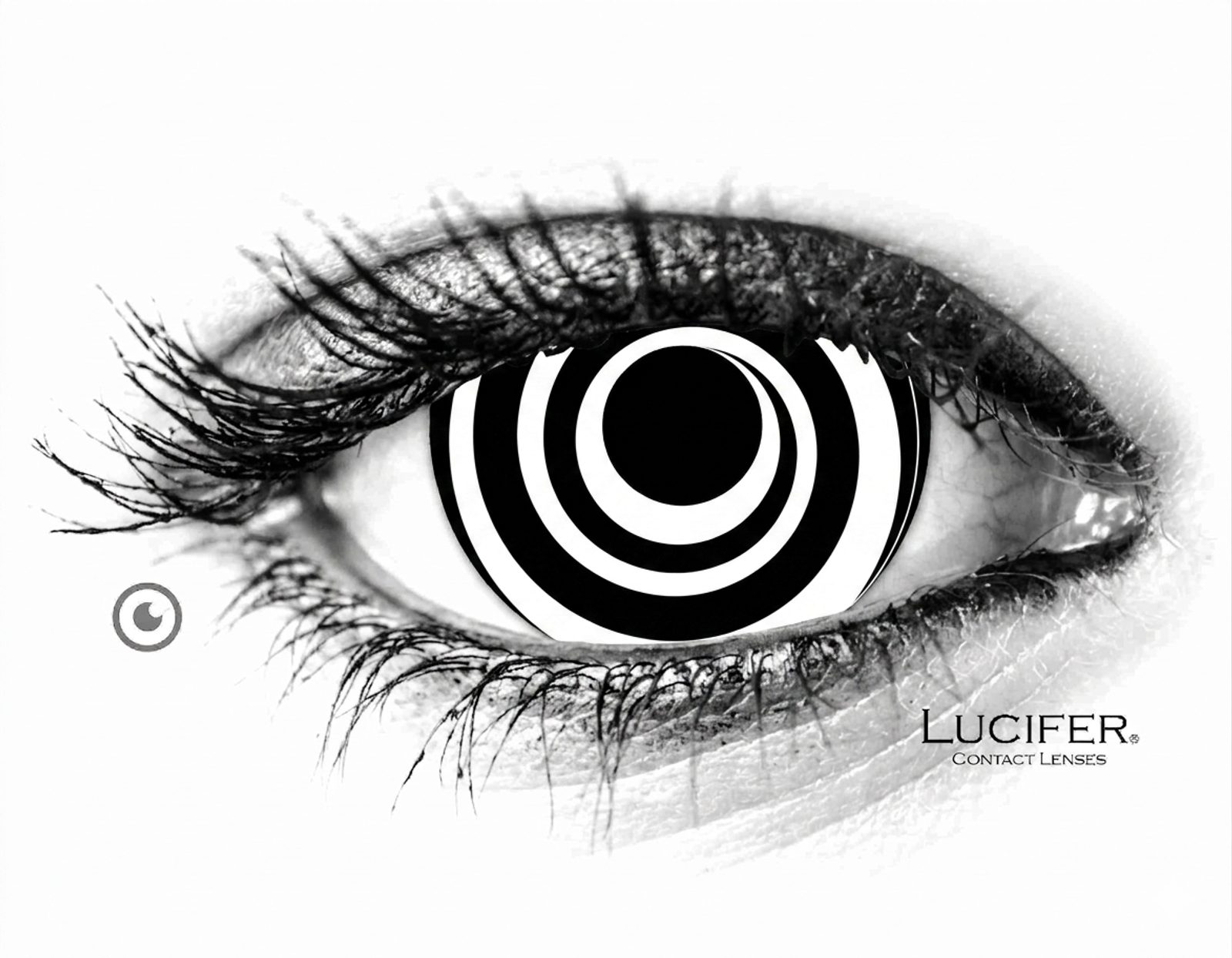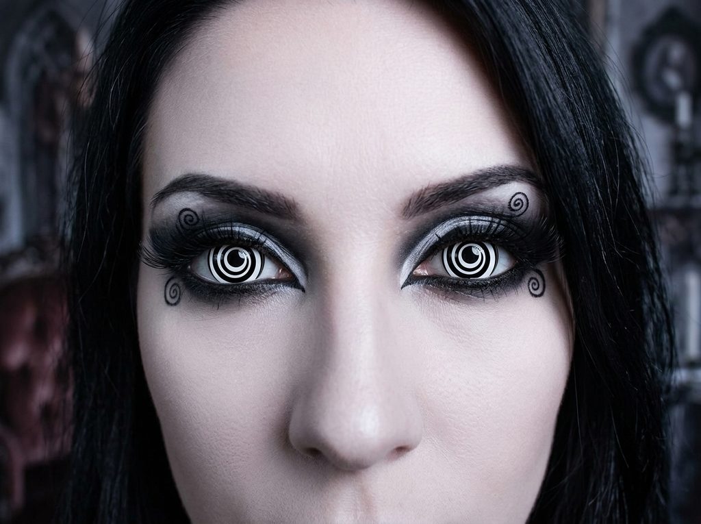 BLACK SPIRAL mini sclera 17mm: nedioptrické barevné čočky s hypnotickým bílo černým designem, které pokrývají větší plochu oka pro děsivý a výrazný vzhled. Ideální volba pro cosplay, Halloween nebo hororové líčení, které zaručeně upoutá pozornost!